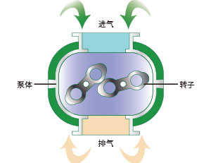 泵腔内装有一对同步反向高速旋转的8字转子,工作时两转子在泵腔内产生吸气和排气作用。罗茨真空泵不能单独排气,必须与前级泵(如螺杆泵、旋片泵、水环泵等)串联使用。